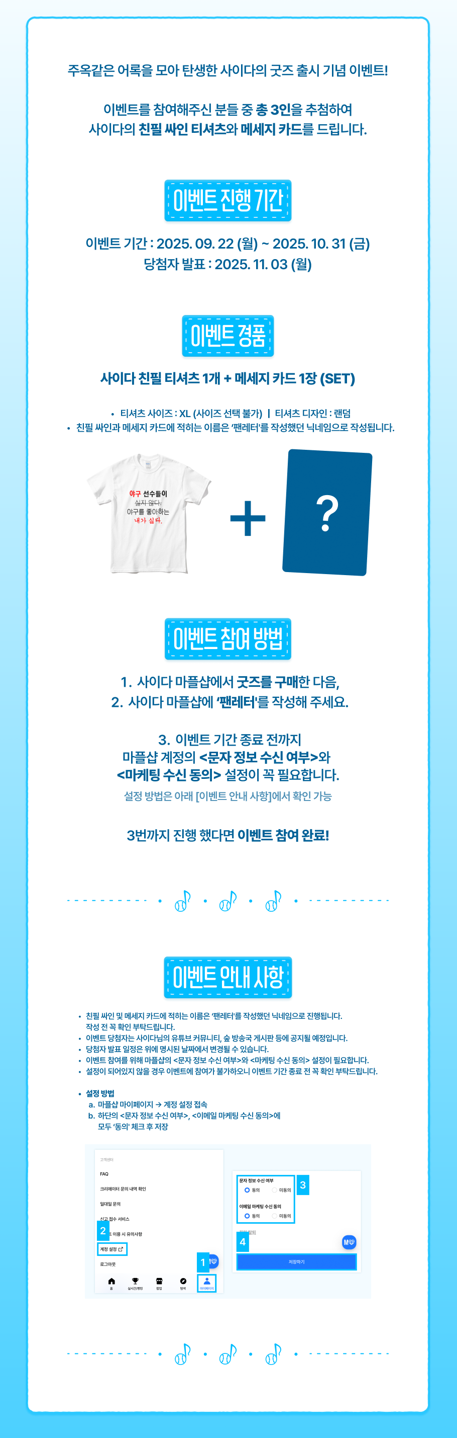 ❗️굿즈 구매 후 사이다 마플샵에 '팬레터'를 작성하면, 추첨을 통해 <사이다의 친필 싸인이 담긴 티셔츠>와 <메세지 카드>를 받아보실 수 있어요.