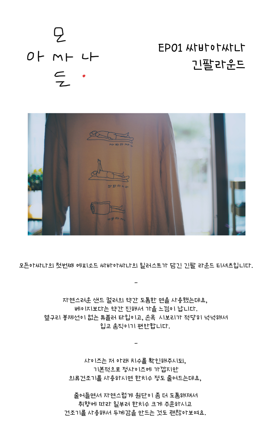 모든아싸나의 첫번째 Episode 싸바아싸나(savasana) 시리즈를 담은 긴팔라운드 티셔츠입니다.