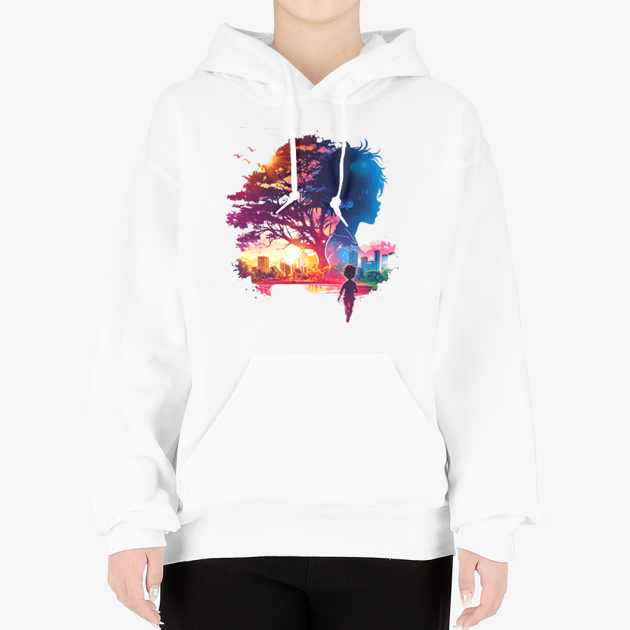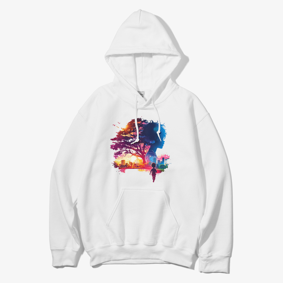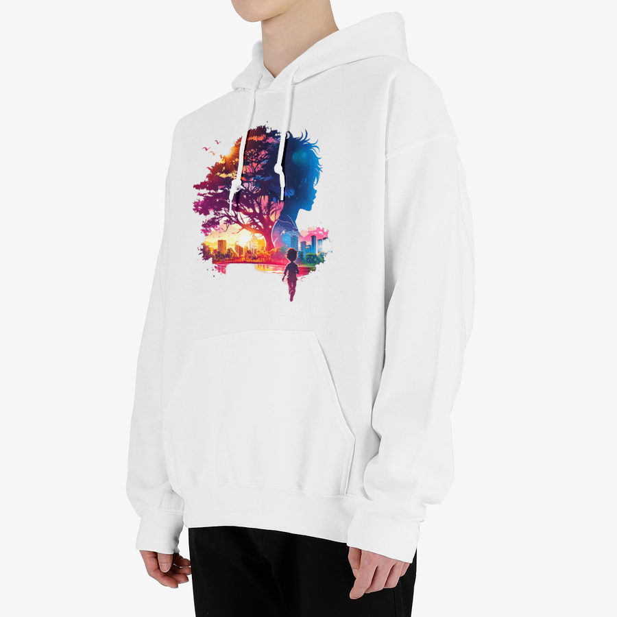 이 생동감 넘치는 예술 작품은 자연과 도시 생활의 대비를 포착하여 아이의 프로필 실루엣과 빛나는 나무, 도시 스카이라인을 혼합합니다.