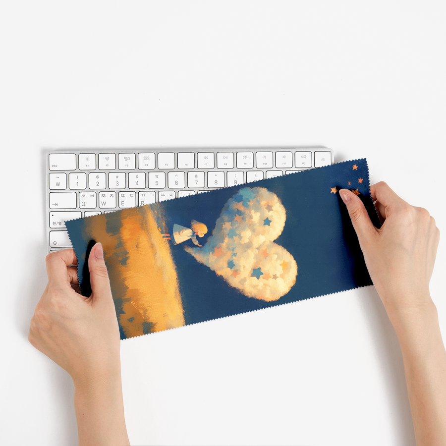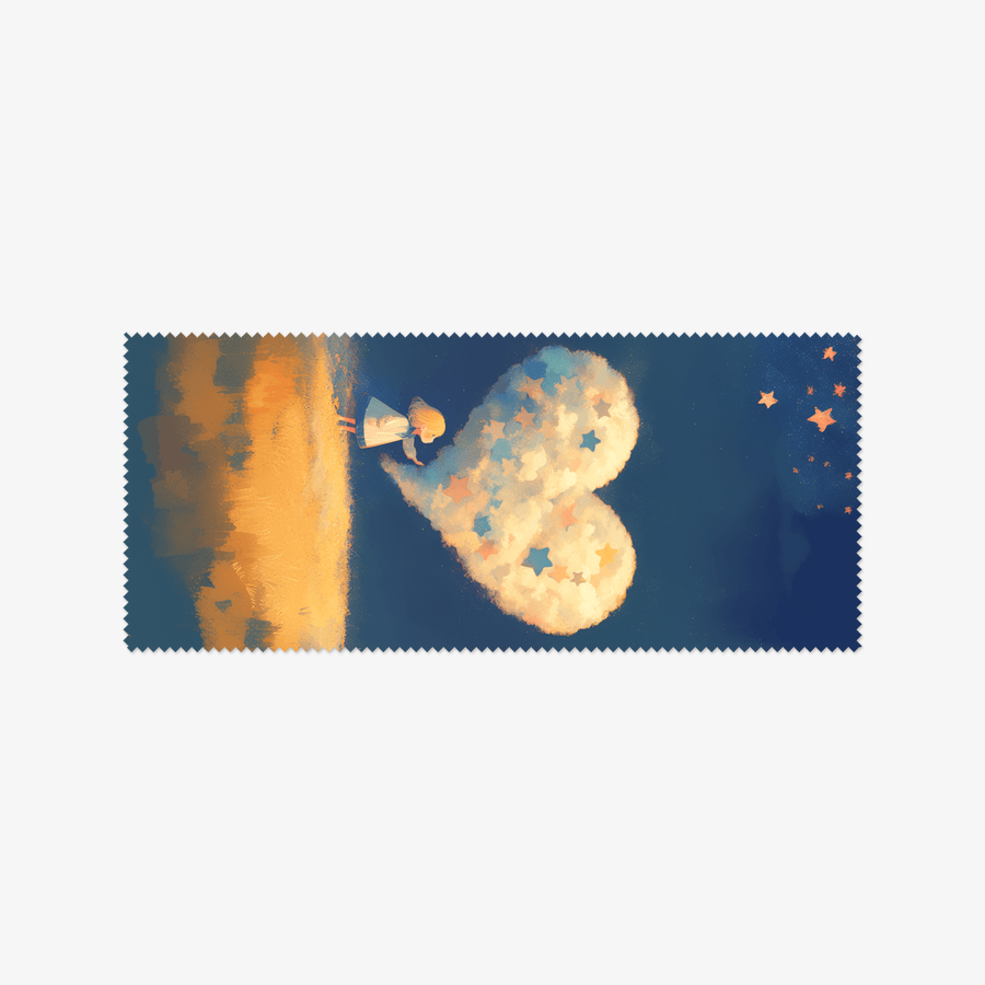 한 어린 소녀가 부드러운 별빛으로 빛나는 하트 모양의 구름을 향해 부드럽게 손을 뻗습니다.