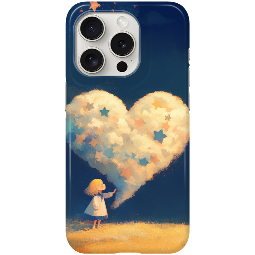 한 어린 소녀가 부드러운 별빛으로 빛나는 하트 모양의 구름을 향해 부드럽게 손을 뻗습니다.