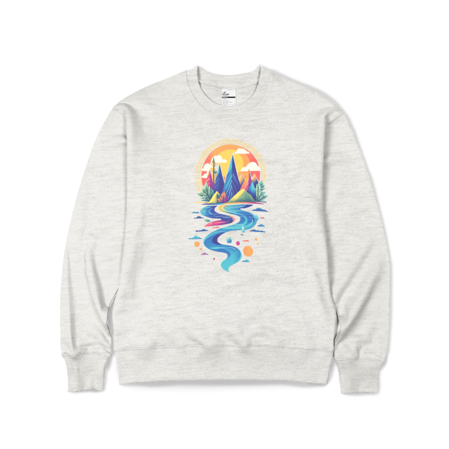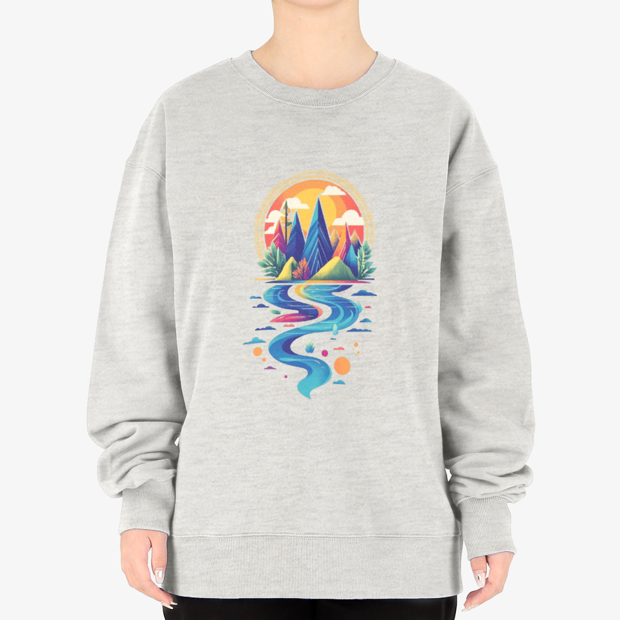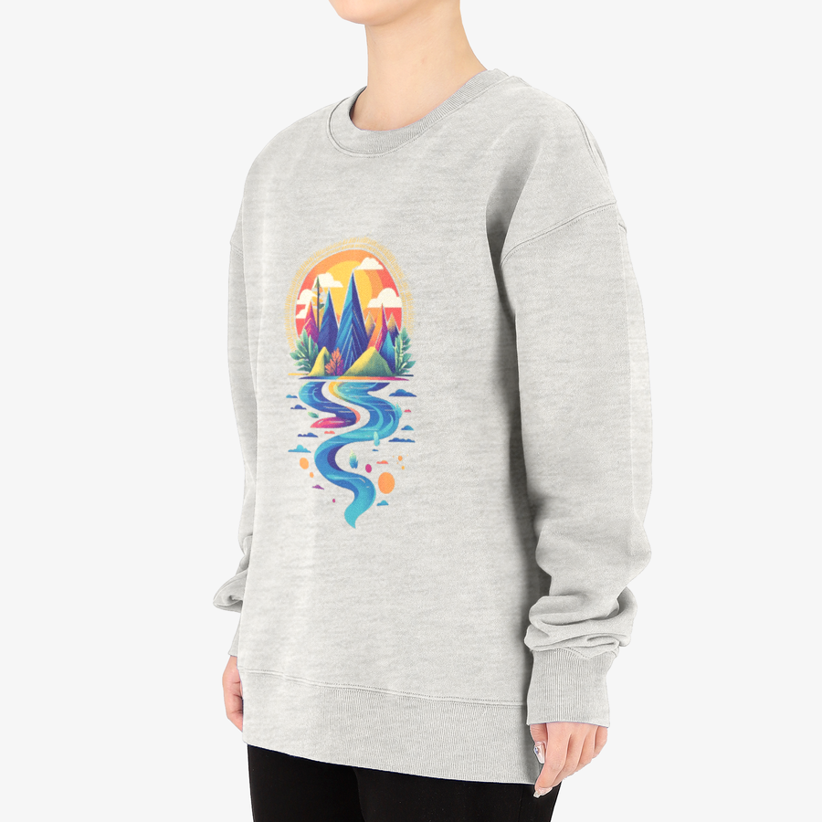 이 생생한 일러스트레이션은 태양의 따뜻한 빛 아래 고요한 강이 기하학적 산을 휘감으며 흐르는 역동적인 풍경을 포착합니다.