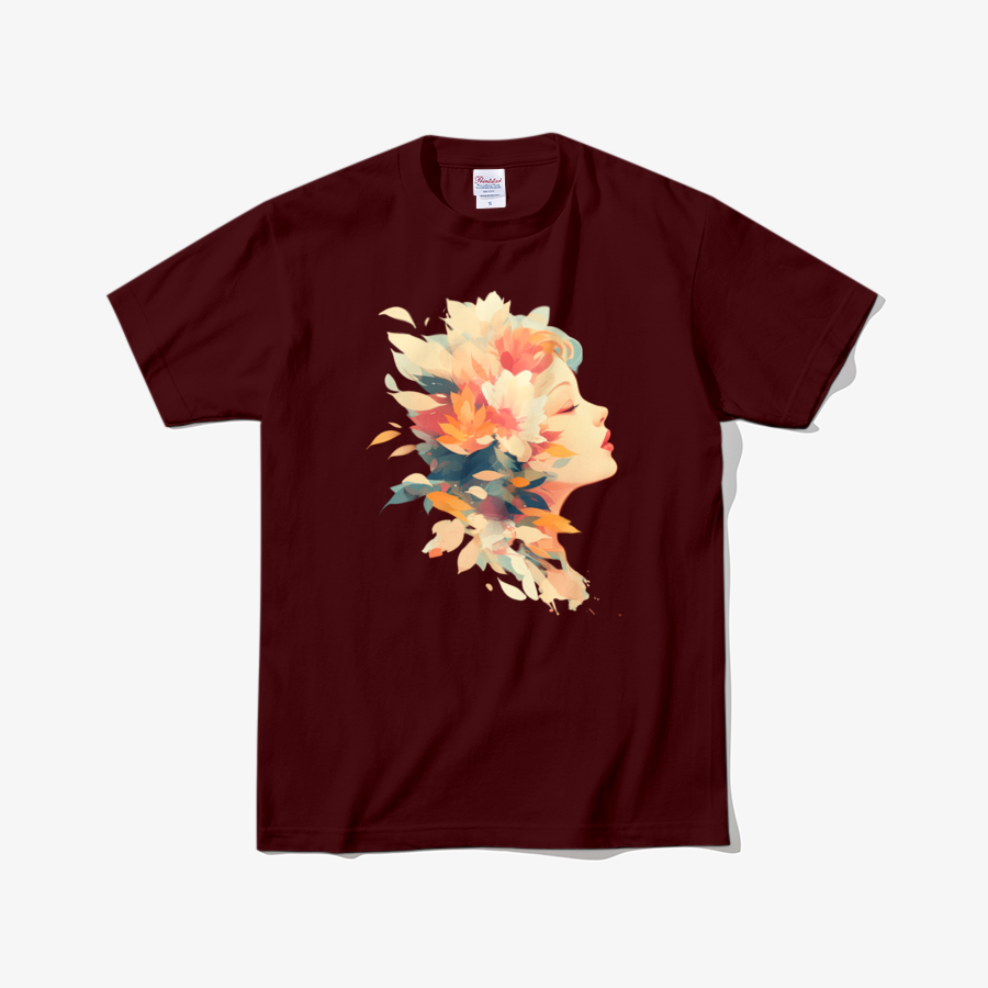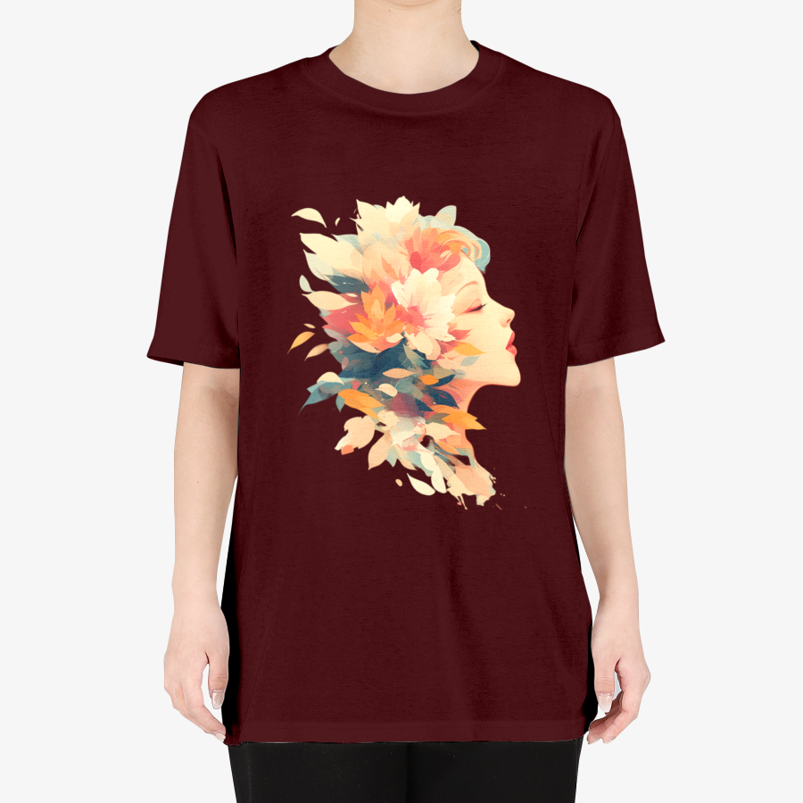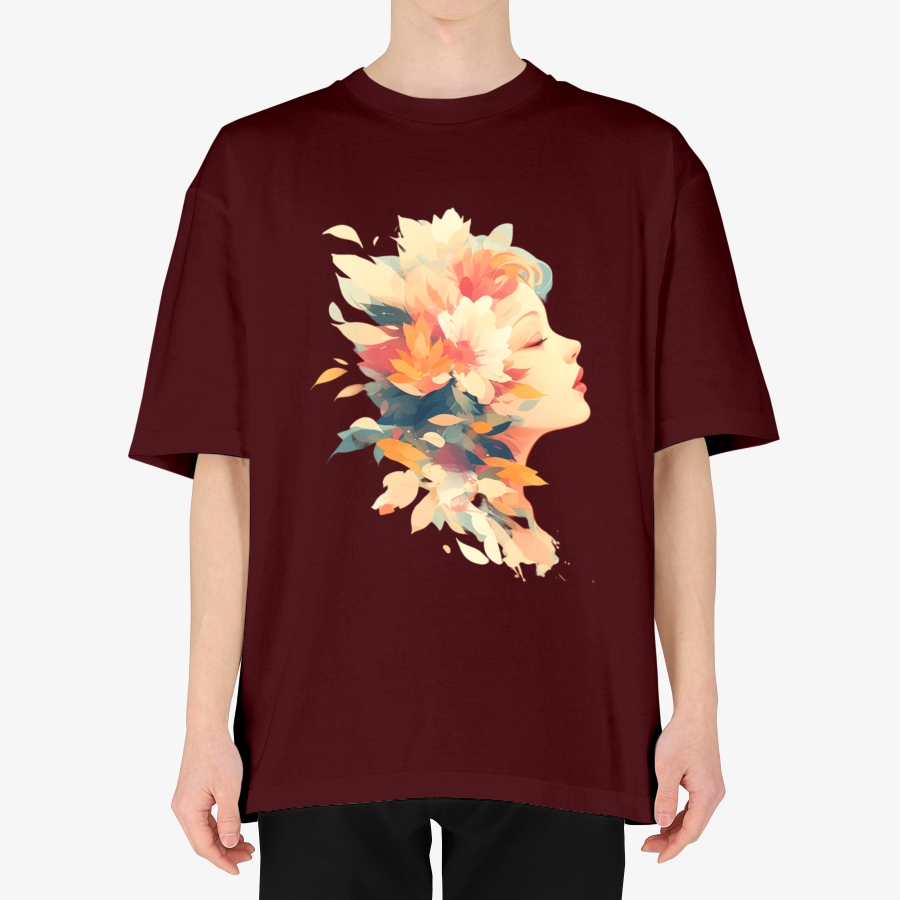 그녀의 머리카락은 추상적인 꽃과 나뭇잎의 연쇄적인 조화로 매끄럽게 어우러져 자연과 연관성을 불러일으킵니다.