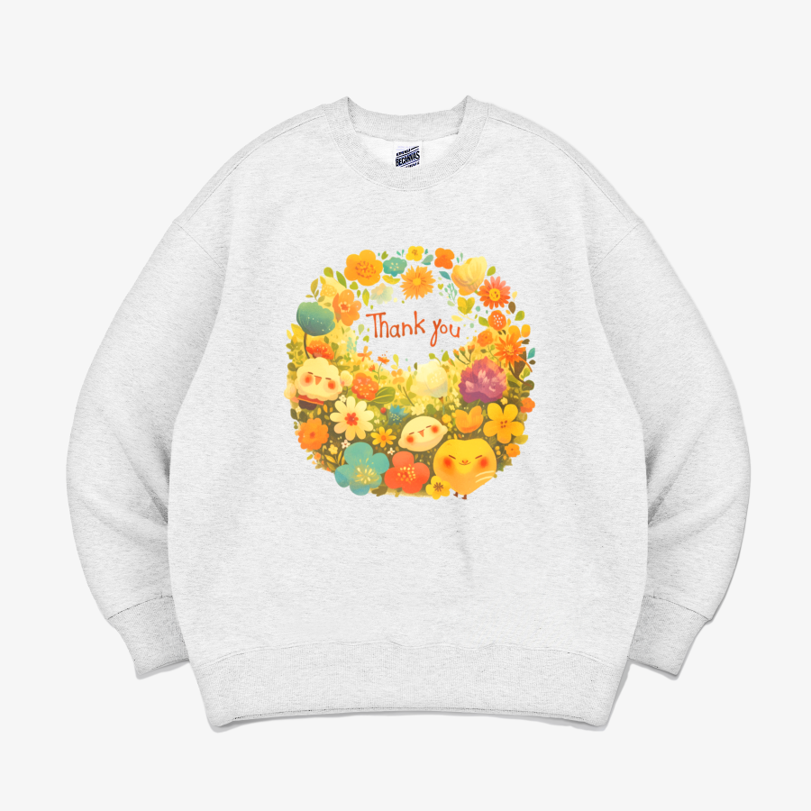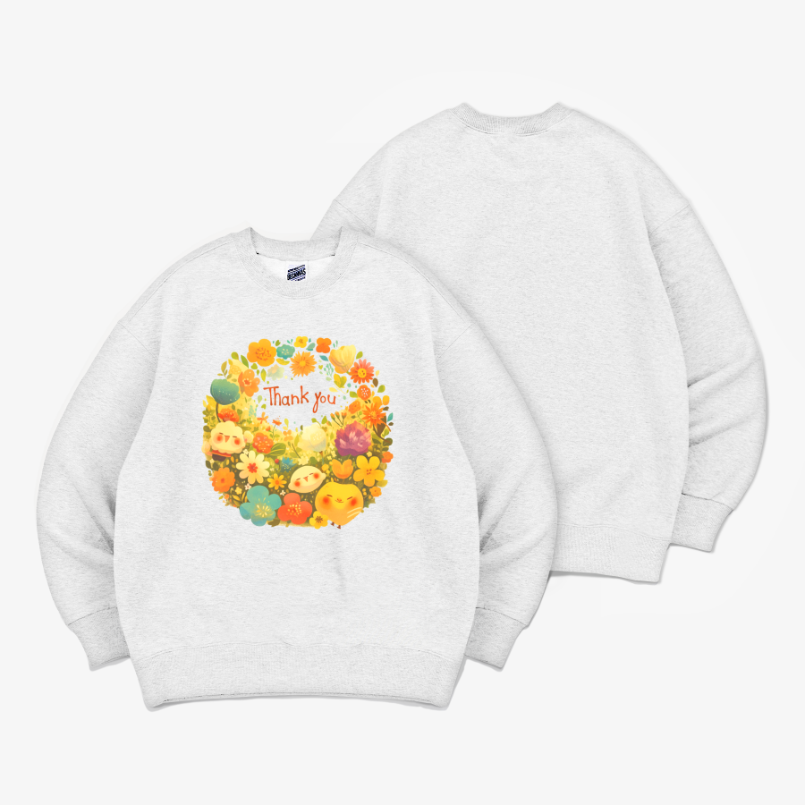 다채로운 꽃과 웃는 캐릭터로 구성된 활기찬 화환이 경쾌한 손글씨로 "감사합니다"라는 단어를 둘러싸고 있습니다.