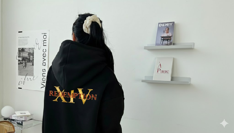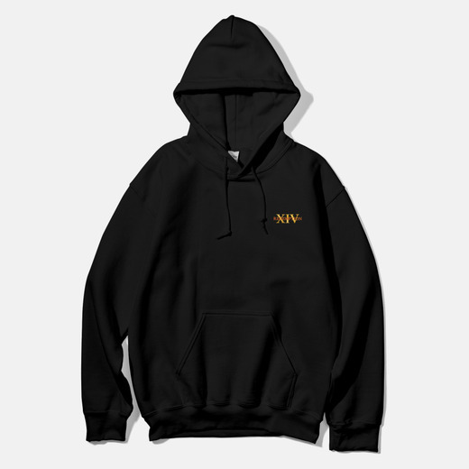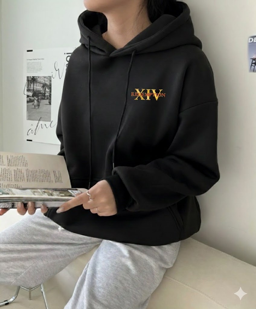 로마숫자14와 리뎀션의 그래픽이 나염 인쇄 되어있는 봄까지 따듯히 입을 수 있는 기모후드!