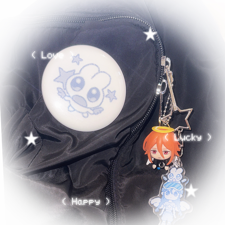 It is a 58mm diameter pin button with clothes pins on the back, allowing you to attach it to a bag or piece of clothing.