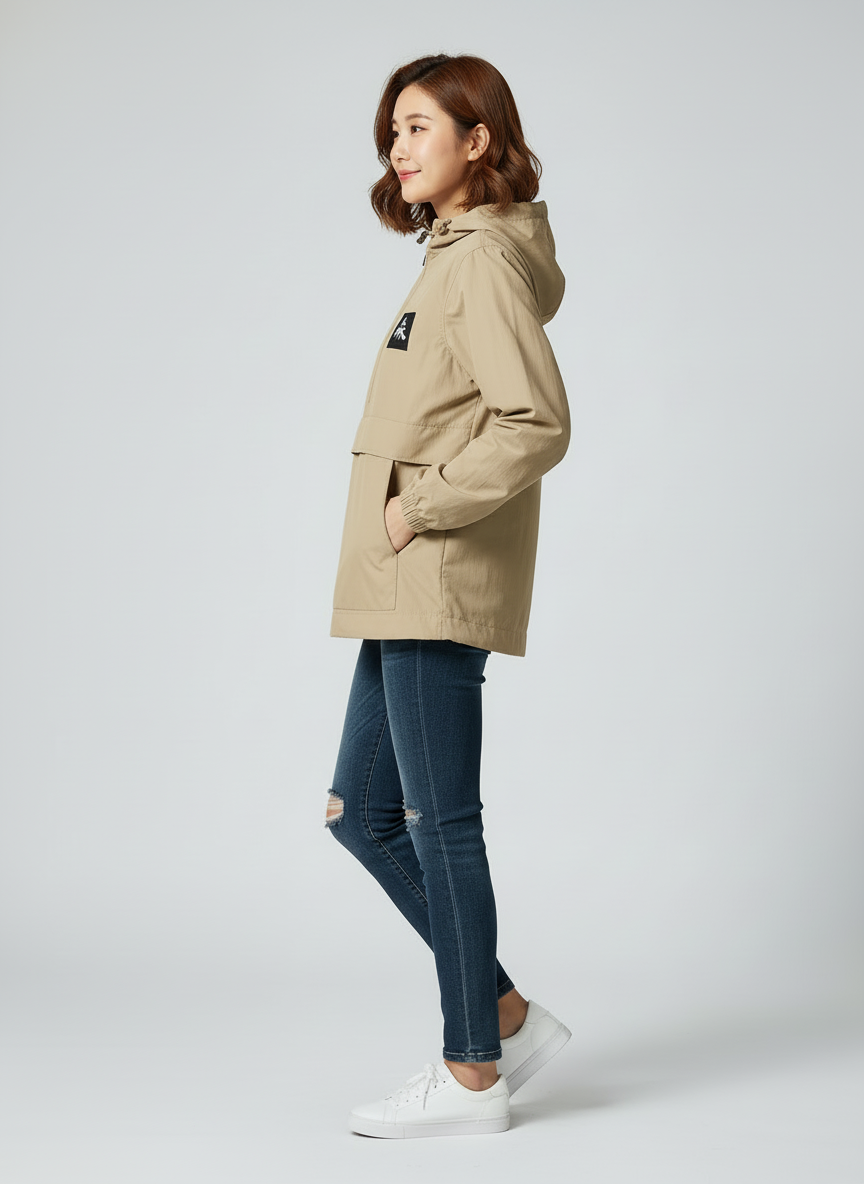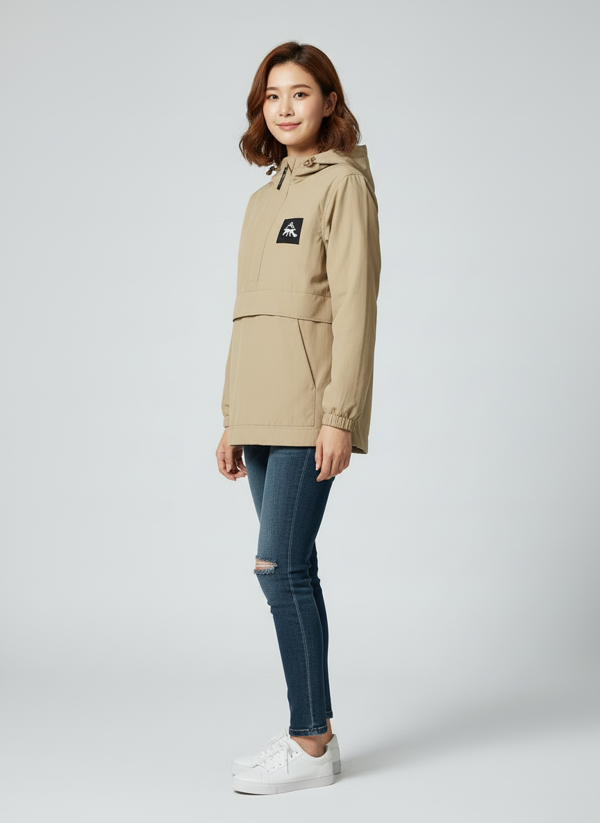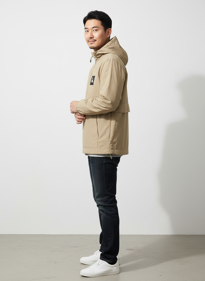 It is a lightweight anorak windbreaker made of nylon.