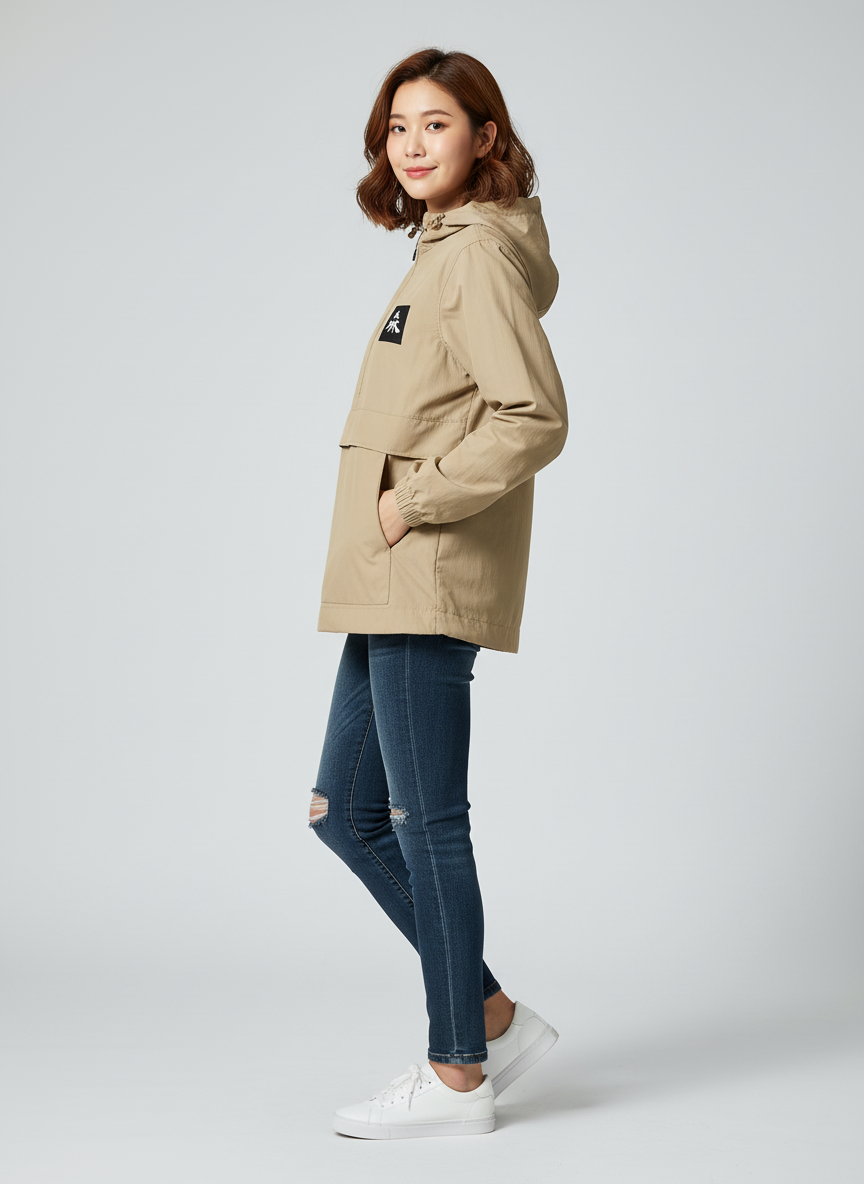 Using the hood and the string on the left hem, different styling options are available.