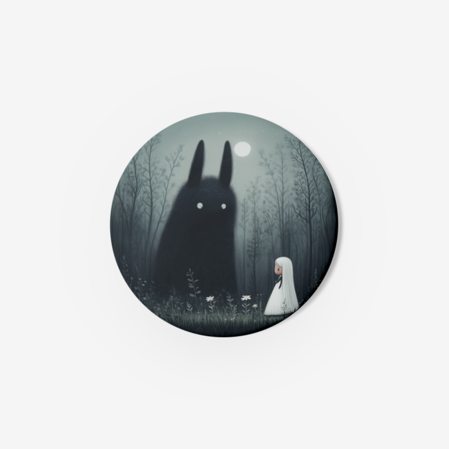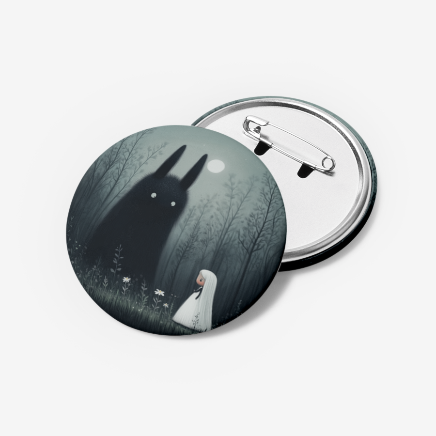 It is a 58mm diameter pin button with clothes pins on the back, allowing you to attach it to a bag or piece of clothing.