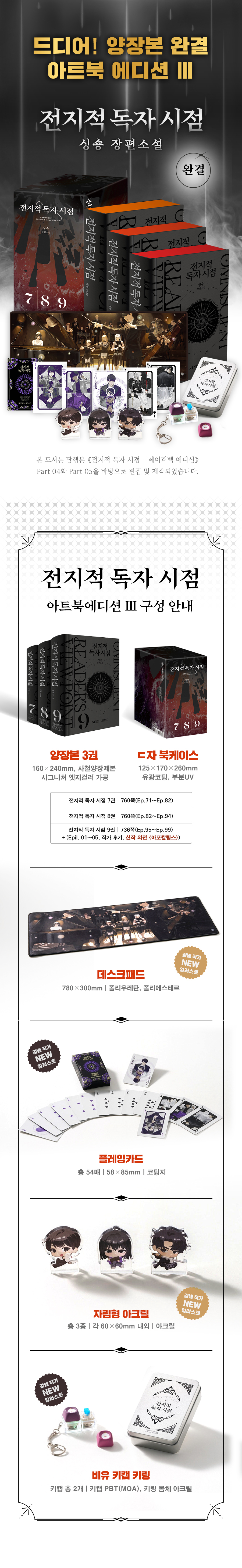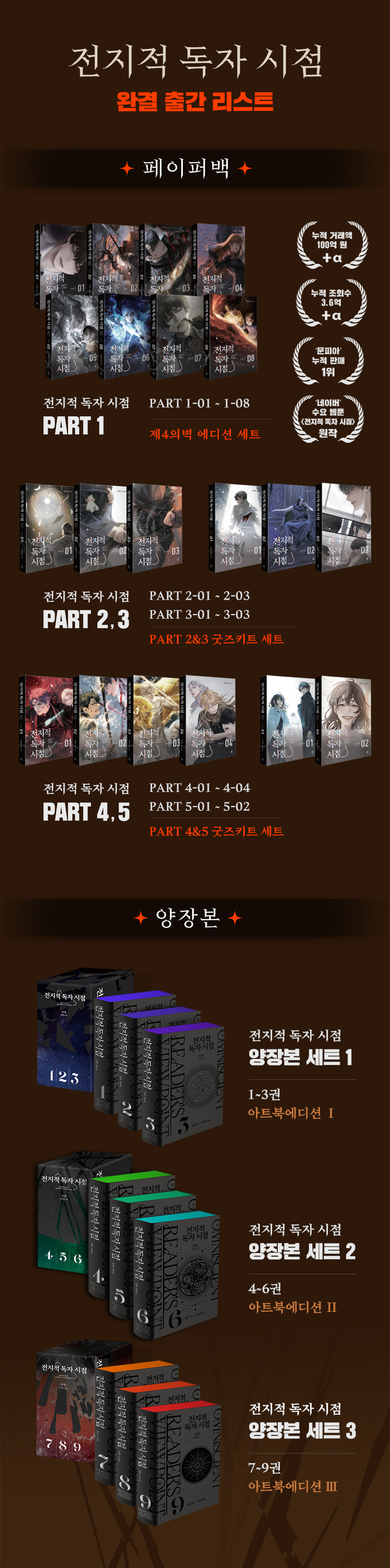 한국 웹소설이 남긴 가장 거대한 족적, 끝없는 현재 진행형 레전드 《전지적 독자 시점》! 김영사의 문학 브랜드 비채에서는 《전지적 독자 시점》의 페이퍼백 에디션(Part 1~5)을 20권으로 완결하였고, 양장본과 굿즈세트가 포함된 아트북에디션을 2022년부터 출간해왔다. 2025년, 드디어 《전지적 독자 시점》 공식 양장본이 그랜드 피날레를 맞이한다.