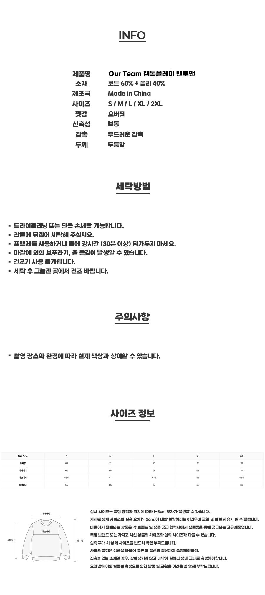 • 상세 사이즈는 측정 방법과 위치에 따라 1~3cm 오차가 발생할 수 있습니다. 기재된 상세 사이즈와 실측 오차(1~3cm)에 대한 불량처리는 어려우며 교환 및 환불 사유가 될 수 없습니다.