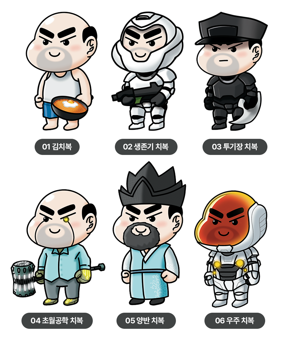 사이즈: 01 김치복 40×63 mm/ 02 생존기 치복 41×64 mm/ 03 투기장 치복 44×68 mm/ 04 초월공학 치복 52×63 mm/ 05 양반 치복 41×76 mm/ 06 우주 치복 42×64 mm