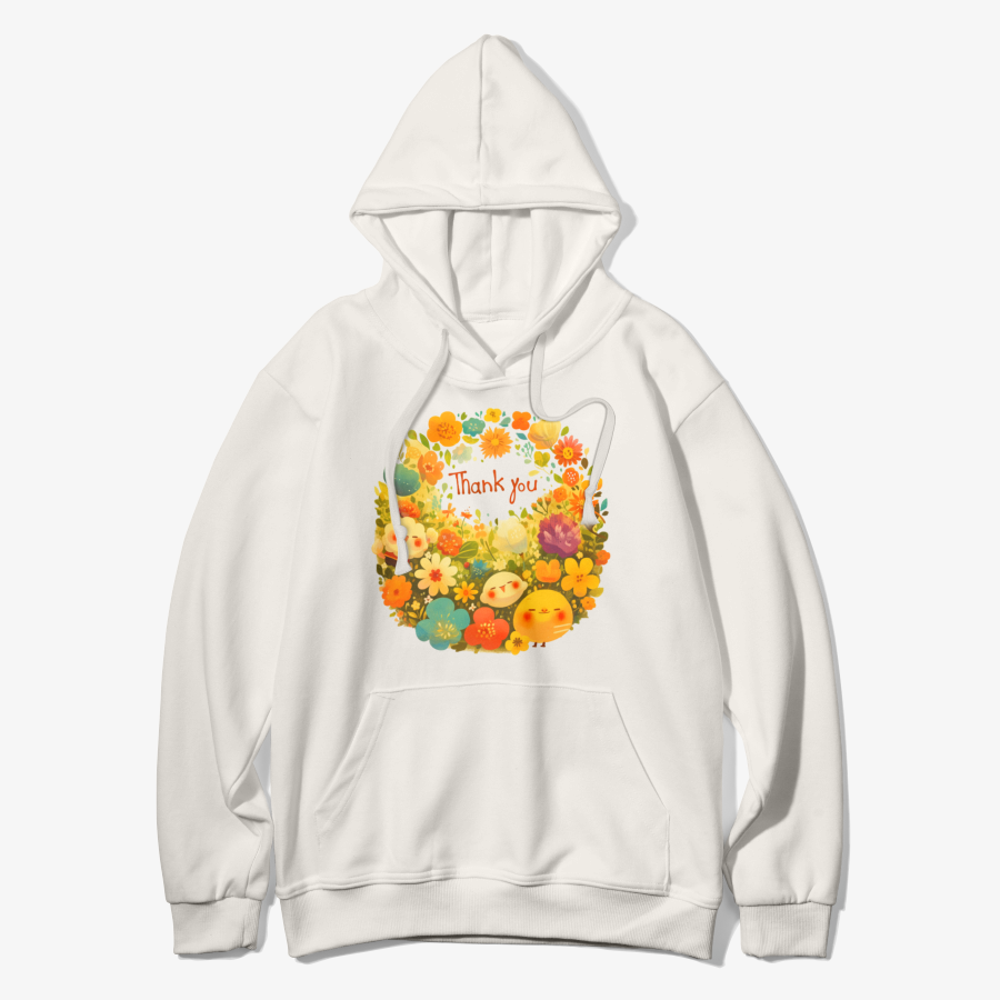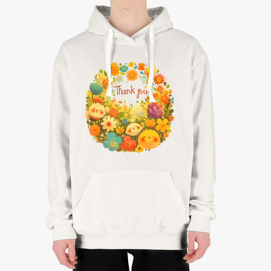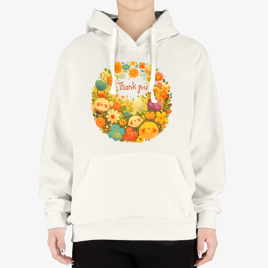 다채로운 꽃과 웃는 캐릭터로 구성된 활기찬 화환이 경쾌한 손글씨로 "감사합니다"라는 단어를 둘러싸고 있습니다.