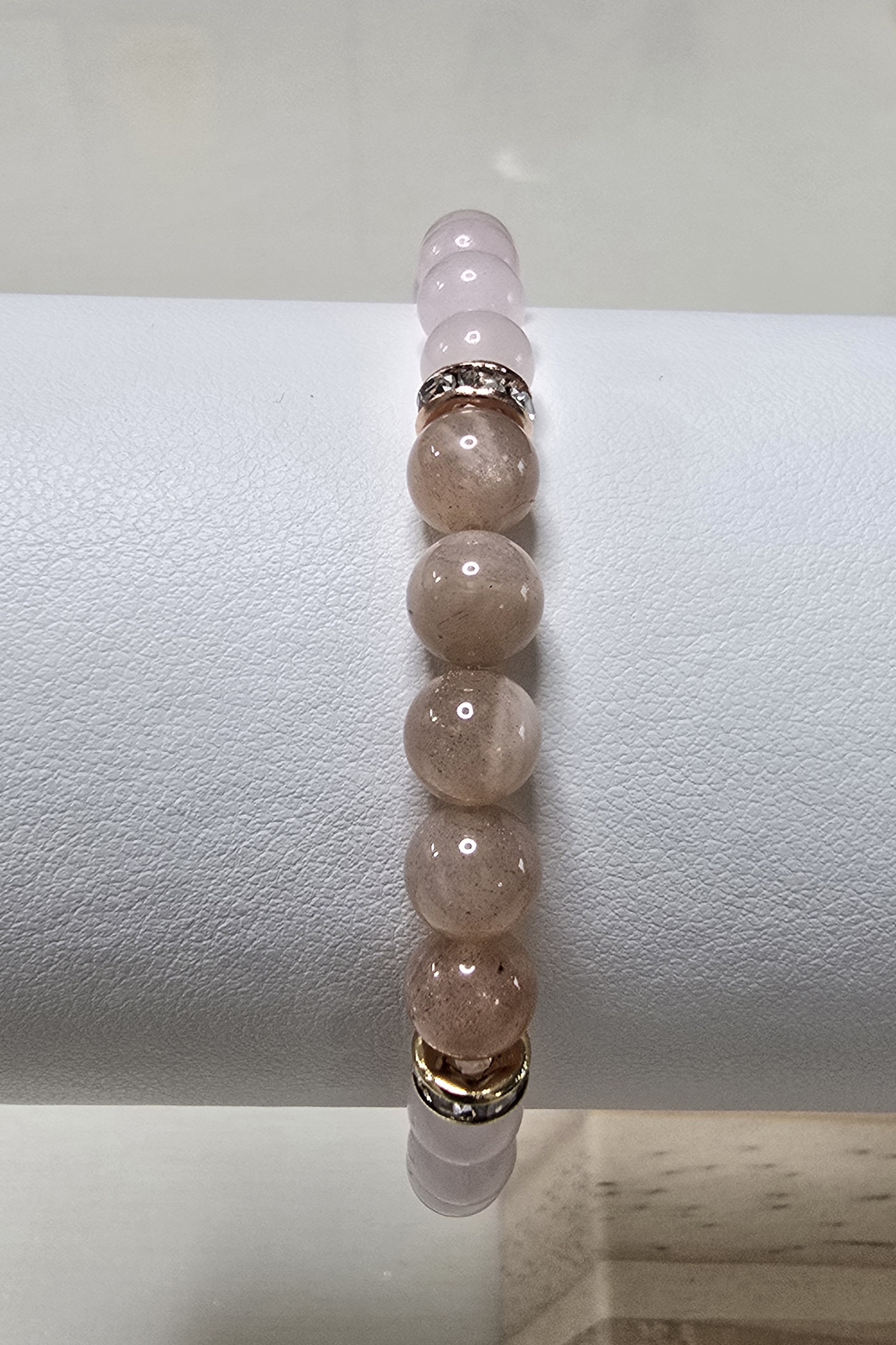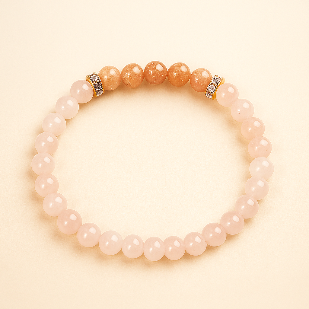 썬스톤으로 활력 회복, 낙천성, 자기표현 강화의 힘을주고 로즈쿼츠로 불안, 우울, 외로움을 완화하고 마음에 평온함을 줄 수 있습니다.