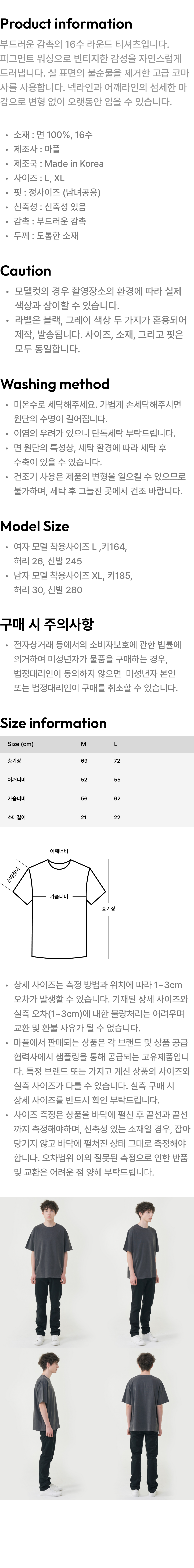 부드러운 감촉의 16수 라운드 티셔츠입니다.