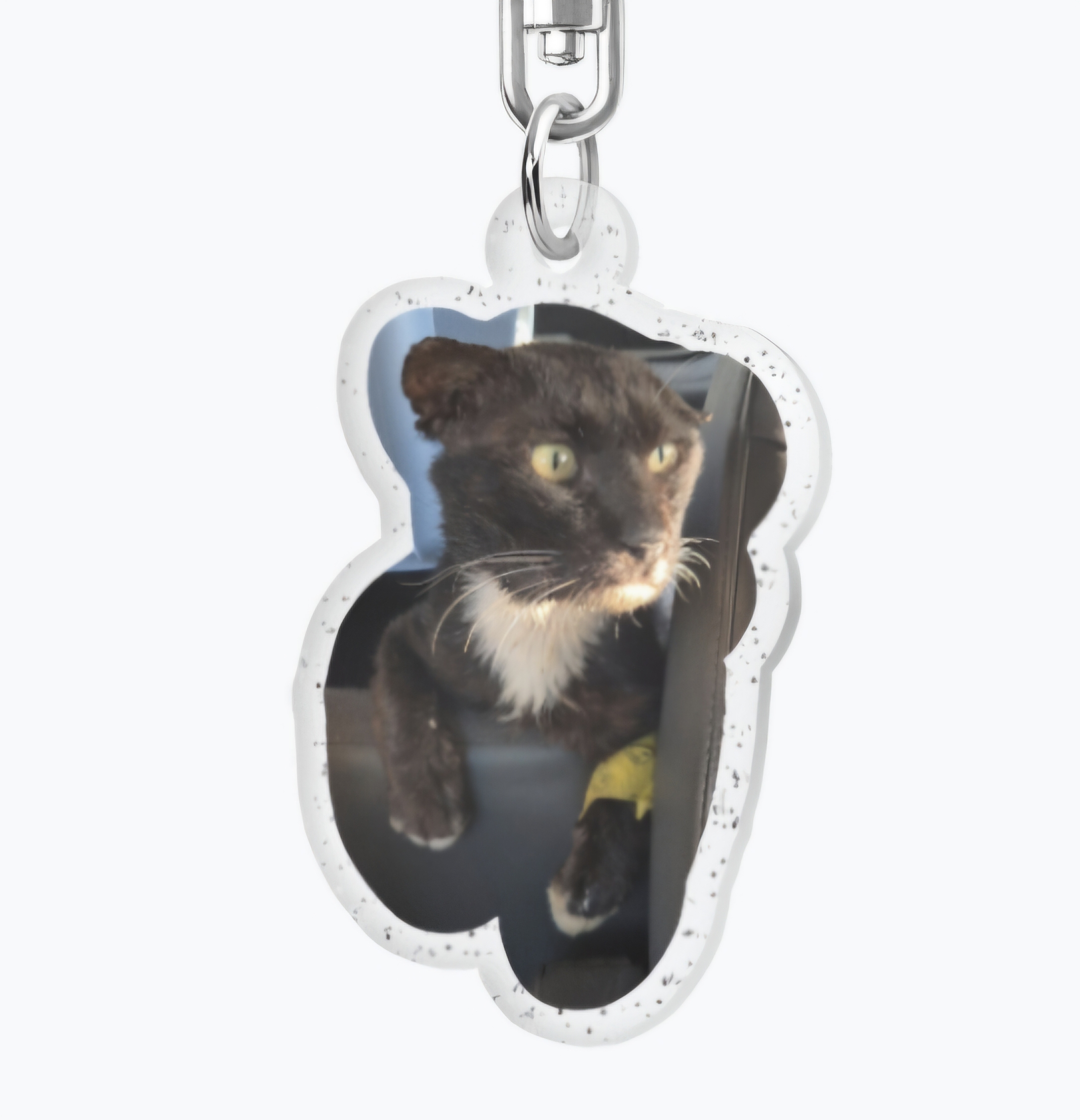 수액과 피검사를위해 바늘을 꼽고 통원치료를 다니던 시절의 기냥이모습을 투명아크릴 키링으로 만들었습니다