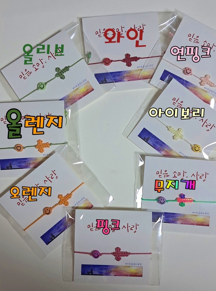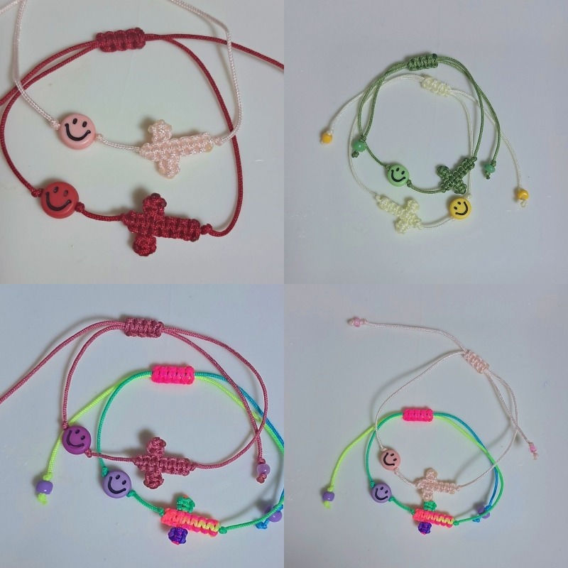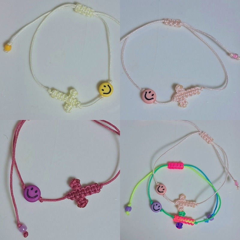스마일 십자가 매듭팔찌는 전통 매듭 기법으로 완성한 십자가 형태에, 스마일 비즈·하트·별 장식을 하나씩 더해 밝은 메시지를 담은 데일리 신앙 팔찌입니다.