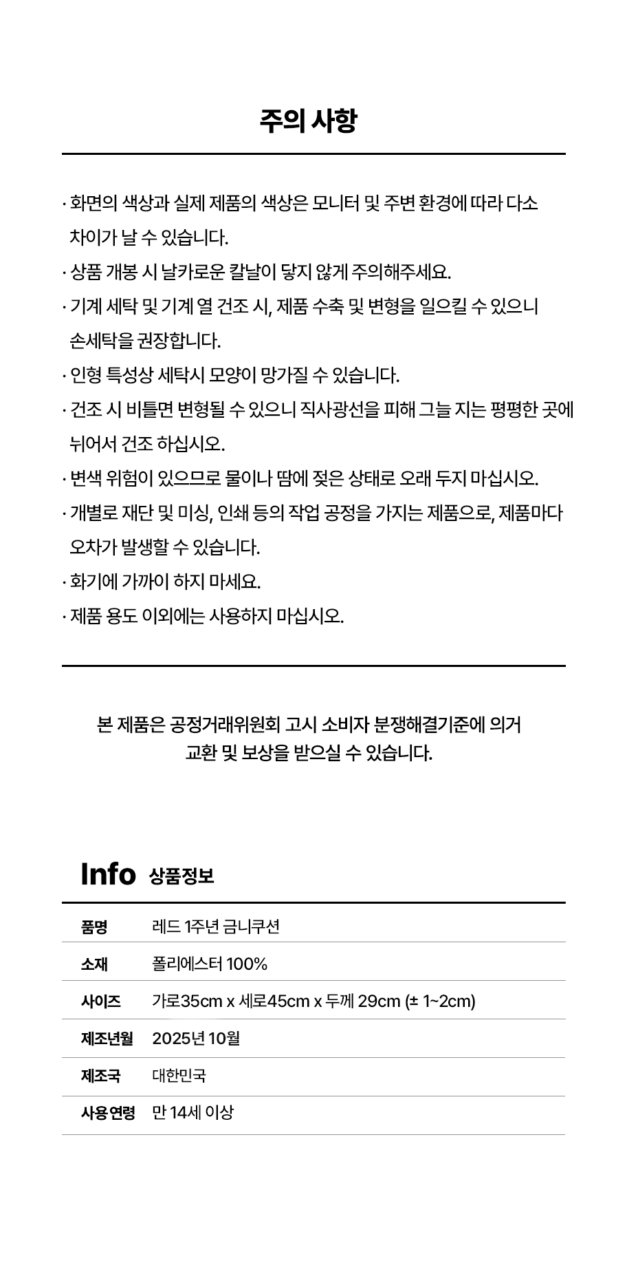 · 품명: 레드 1주년 금니쿠션 · 소재: 폴리에스터 100% · 사이즈 : 가로35cm x 세로45cm x 두께 29cm (± 1~2cm) · 제조년월: 2025년 9월 · 제조국: 중국 · 사용연령: 만 14세 이상