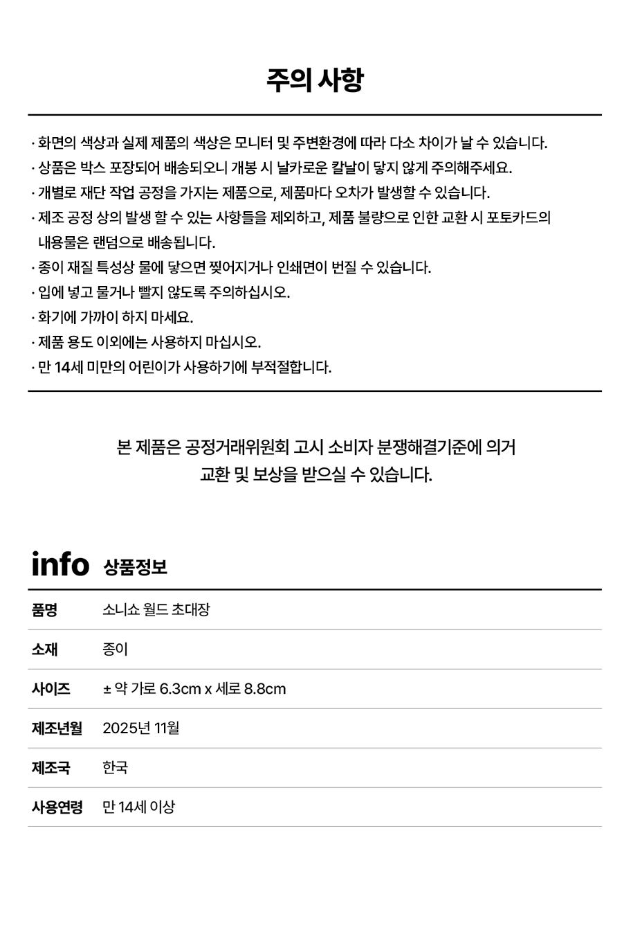 · 제조 공정 상의 발생 할 수 있는 사항들을 제외하고, 불량으로 인한 교환 시 포토카드의 내용물은 랜덤으로 배송됩니다.