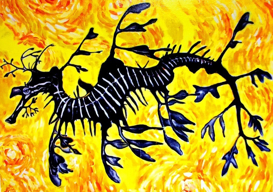 The background is painted with Van Gogh's technique. The leaves of the skin that grow in leafy sea dragons provide gastrointestinal function and look like algae. It can maintain its illusion when swimming, looking like a