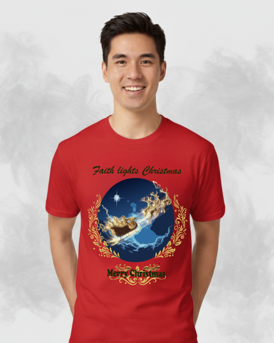 이번 크리스마스에 믿음의 빛을 나누세요. "Faith lights Christmas" (믿음이 크리스마스를 밝힙니다) 문구가 담긴 레터링 티셔츠입니다.